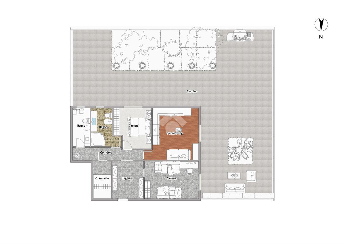 L'appartamento è composto da: ingresso in disimpegno, salone living, due camere da letto, vano lavanderia e doppi servizi.