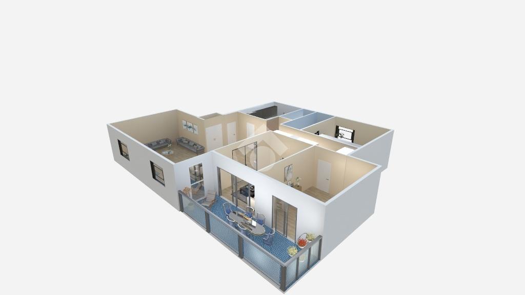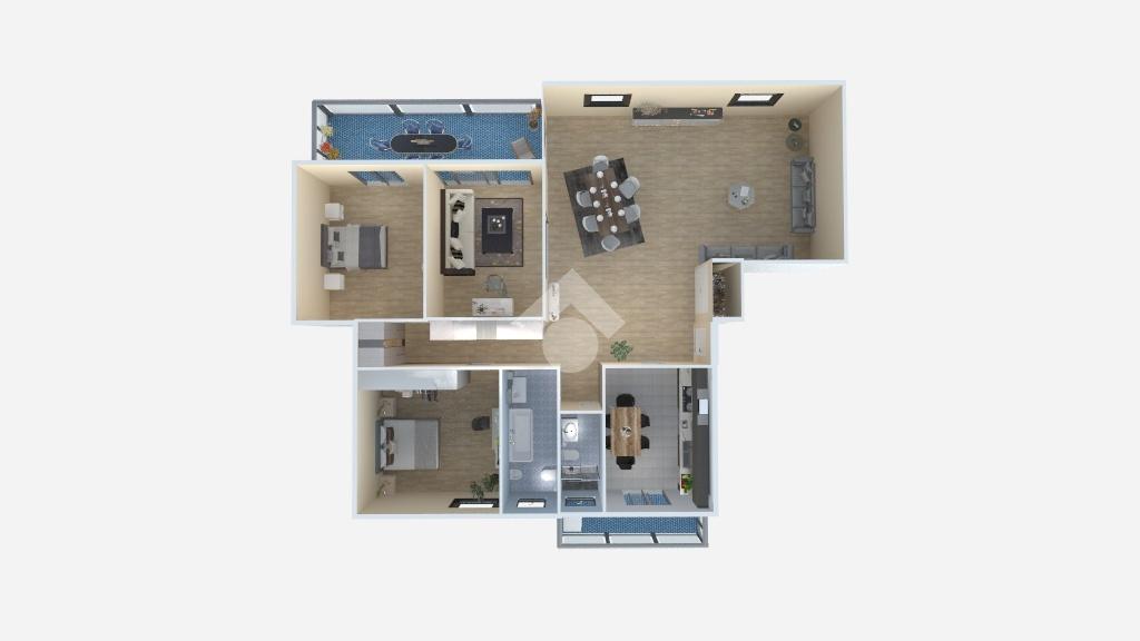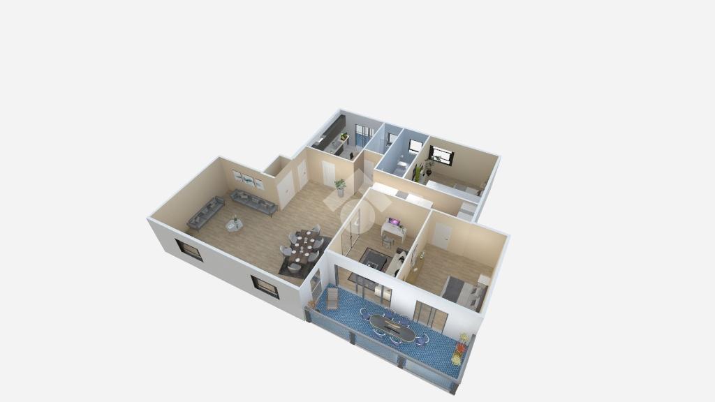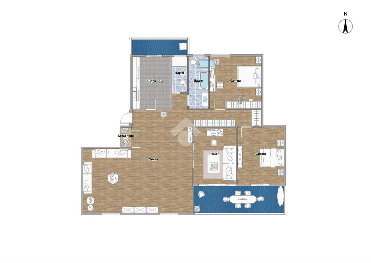 L'appartamento è posto ad un sesto piano con ascensore ed è composta da: ingresso in salone doppio con uscita sul balcone terrazzato, cucina, studio, due camere da letto e due bagni.